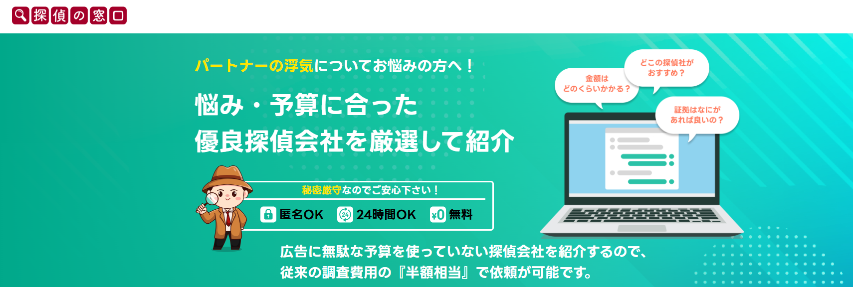 完全無料・匿名OK・24時間対応で、専門のアドバイザーがあなたの状況や予算に合わせた最適な探偵社をご紹介。広告費を抑えた優良探偵社を厳選しているため、従来の調査費用の半額相当で依頼が可能です。